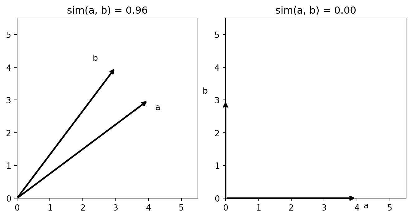 import numpy as npimport matplotlib.pyplot as pltfig, axes = plt.subplots(1, 2)# Left panel: two vectors pointing in similar directionsa1 = np.array([4, 3])b1 = np.array([3, 4])sim1 = np.dot(a1, b1) / (np.linalg.norm(a1) * np.linalg.norm(b1))ax = axes[0]ax.annotate("", xy=a1, xytext=(0, 0), arrowprops=dict(arrowstyle="->", lw=2))ax.annotate("", xy=b1, xytext=(0, 0), arrowprops=dict(arrowstyle="->", lw=2))ax.text(a1[0] +0.2, a1[1] -0.3, "a")ax.text(b1[0] -0.7, b1[1] +0.2, "b")ax.set_title(f"sim(a, b) = {sim1:.2f}")ax.set_xlim(0, 5.5)ax.set_ylim(0, 5.5)ax.set_aspect("equal")# Right panel: two perpendicular vectorsa2 = np.array([4, 0])b2 = np.array([0, 3])sim2 = np.dot(a2, b2) / (np.linalg.norm(a2) * np.linalg.norm(b2))ax = axes[1]ax.annotate("", xy=a2, xytext=(0, 0), arrowprops=dict(arrowstyle="->", lw=2))ax.annotate("", xy=b2, xytext=(0, 0), arrowprops=dict(arrowstyle="->", lw=2))ax.text(a2[0] +0.2, a2[1] -0.3, "a")ax.text(b2[0] -0.7, b2[1] +0.2, "b")ax.set_title(f"sim(a, b) = {sim2:.2f}")ax.set_xlim(0, 5.5)ax.set_ylim(0, 5.5)ax.set_aspect("equal")plt.tight_layout()plt.show()