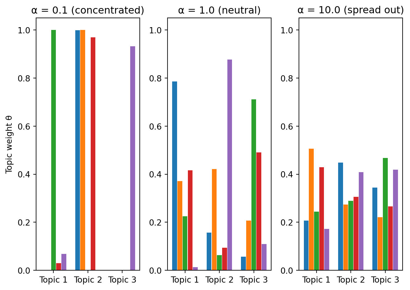 Each group of bars is one sampled document’s topic mixture. With small \(\alpha\), each document is dominated by a single topic — the bars are all-or-nothing. With large \(\alpha\), every document is a roughly equal blend — the bars are nearly the same height. In practice, real text corpora tend to have small \(\alpha\) — most documents focus on a few topics, not all of them equally. A news article about an oil price shock is mostly about energy, with perhaps a small amount of monetary policy mixed in.