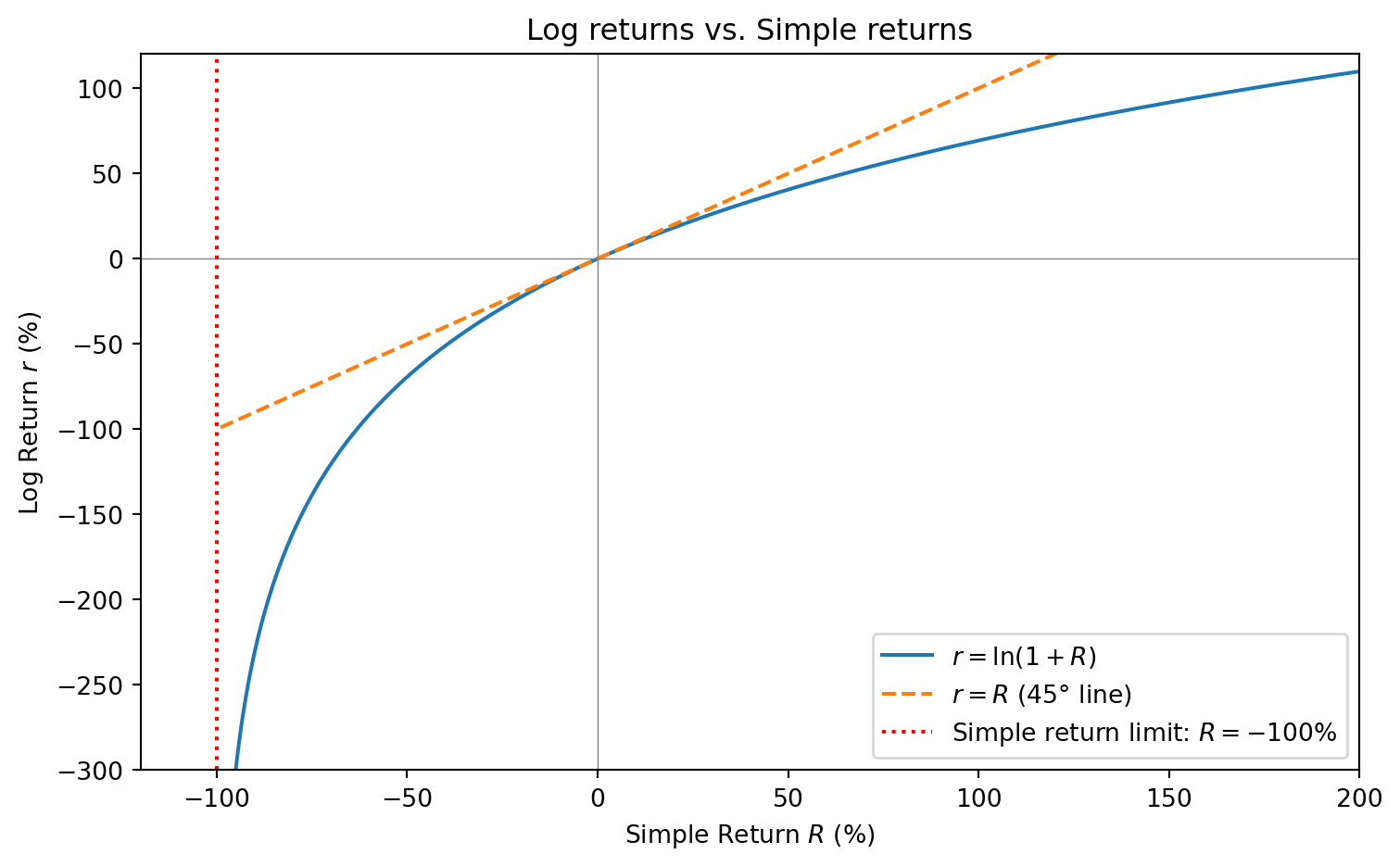 - Unboundedness: Simple returns are bounded below at -100% (you can’t lose more than everything). Log returns range from \(-\infty\) to \(+\infty\), which is better for statistical modeling.