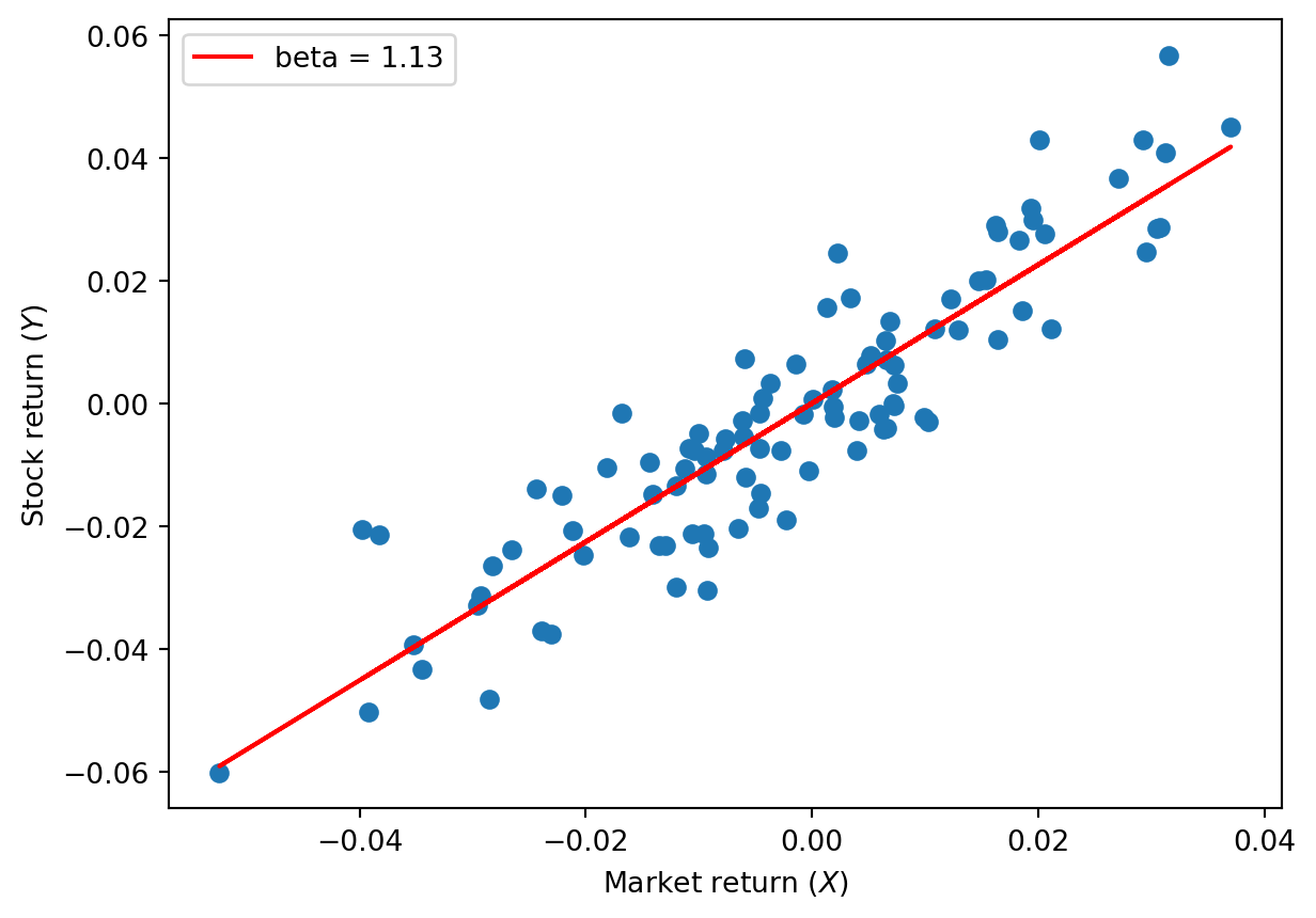 print(f"Correlation: {np.corrcoef(market, stock)[0,1]:.4f}")