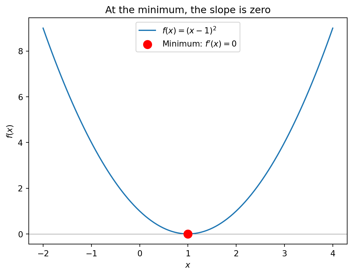 An extremum is a minimum or maximum of a function. At an extremum, the function is flat—it’s neither increasing nor decreasing, so the derivative is zero. To find the minimum of \(f(x)\): take the derivative \(f'(x)\), set \(f'(x) = 0\), and solve for \(x\). You won’t compute derivatives by hand in this course—computers handle that—but you need to understand the logic: the minimum is where the slope is zero.