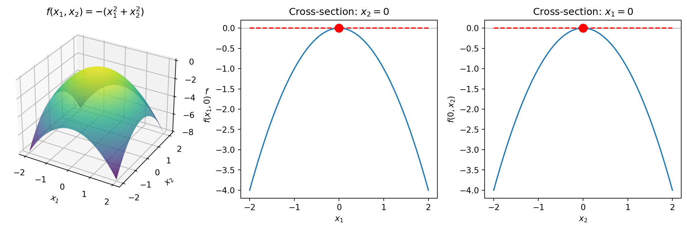 The maximum is at the origin \((0, 0)\)—the top of the “dome.” In both cross-sections, the tangent line is flat (slope = 0) at the extremum.