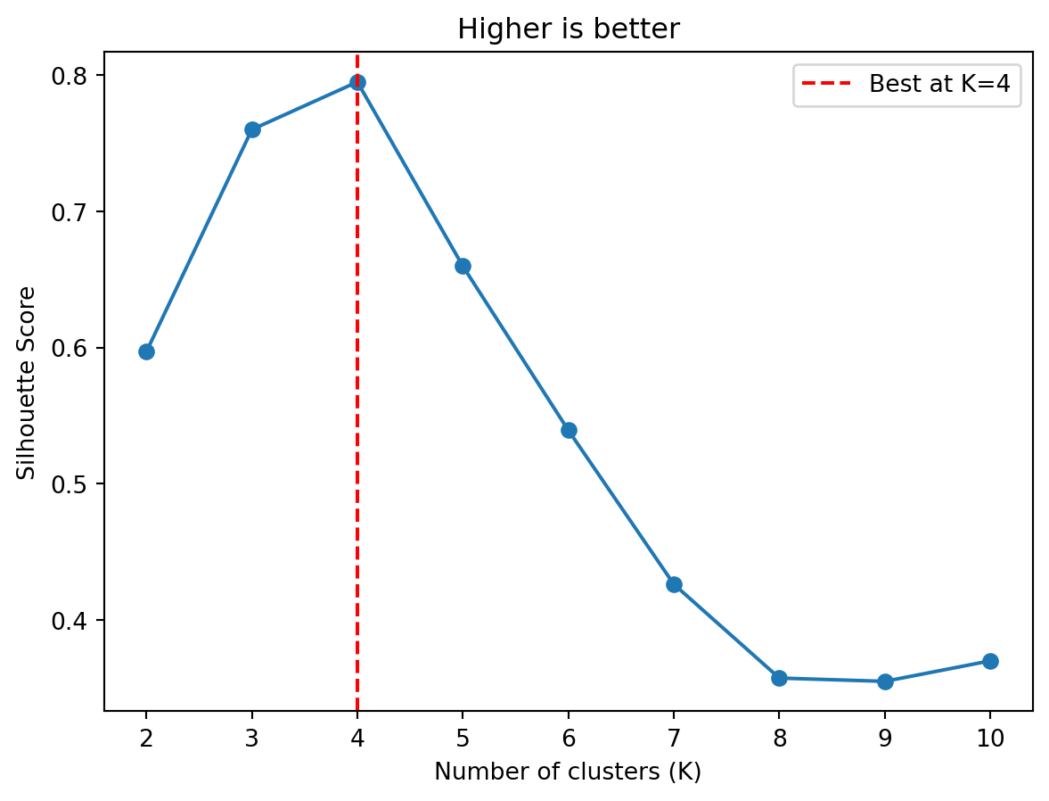from sklearn.metrics import silhouette_score# Compute silhouette score for different Ksilhouette_scores = []K_range =range(2, 11) # silhouette requires K >= 2for k in K_range: kmeans = KMeans(n_clusters=k, random_state=42, n_init=10) labels = kmeans.fit_predict(X) score = silhouette_score(X, labels) silhouette_scores.append(score)fig, ax = plt.subplots()ax.plot(K_range, silhouette_scores, 'o-')ax.set_xlabel('Number of clusters (K)')ax.set_ylabel('Silhouette Score')ax.set_title('Higher is better')ax.axvline(x=4, color='red', linestyle='--', label='Best at K=4')ax.legend()plt.show()