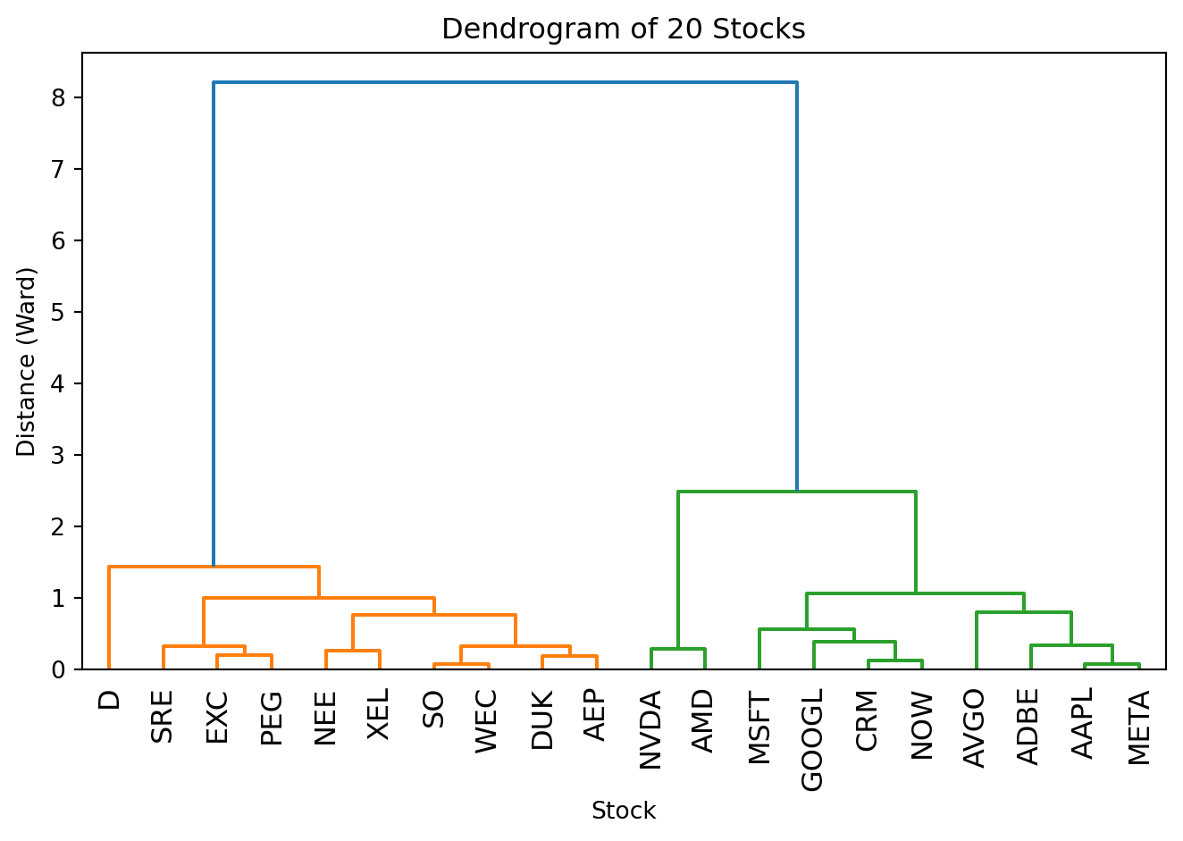 from scipy.cluster.hierarchy import dendrogram, linkage, fcluster# Use our stock dataX_stocks = stocks_df[["beta", "dividendYield"]].valuesstock_tickers = stocks_df["ticker"].values# Standardizescaler_hc = StandardScaler()X_stocks_scaled = scaler_hc.fit_transform(X_stocks)# Perform hierarchical clustering with Ward's methodZ = linkage(X_stocks_scaled, method='ward')# Plot the dendrogramfig, ax = plt.subplots()dendrogram(Z, labels=stock_tickers, ax=ax, leaf_rotation=90)ax.set_xlabel('Stock')ax.set_ylabel('Distance (Ward)')ax.set_title('Dendrogram of 20 Stocks')plt.tight_layout()plt.show()
