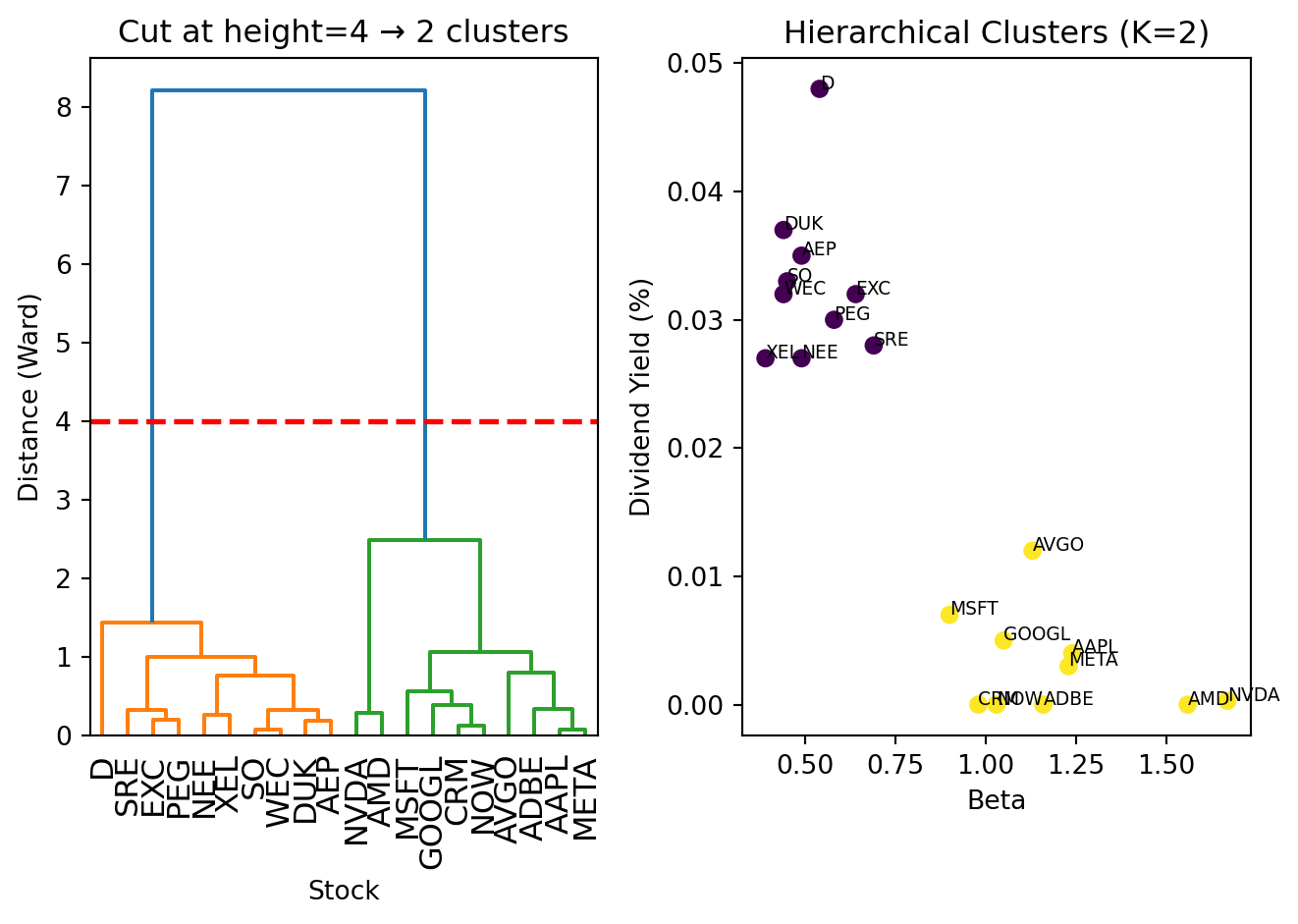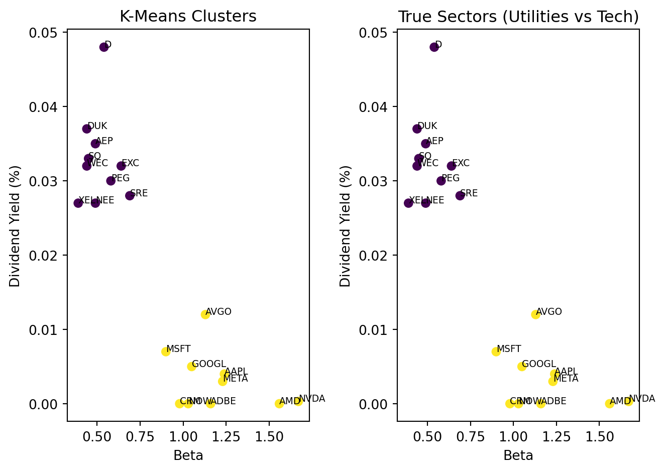 import osimport pandas as pdfrom sklearn.cluster import KMeansimport matplotlib.pyplot as plt# Stock data (pre-cached to avoid API calls)# In practice, you would pull this from yfinancestocks_df = pd.DataFrame({'ticker': ['NEE', 'DUK', 'SO', 'D', 'AEP', 'EXC', 'SRE', 'XEL', 'PEG', 'WEC','AAPL', 'MSFT', 'NVDA', 'GOOGL', 'META', 'AVGO', 'AMD', 'CRM', 'ADBE', 'NOW'],'beta': [0.49, 0.44, 0.45, 0.54, 0.49, 0.64, 0.69, 0.39, 0.58, 0.44,1.24, 0.90, 1.67, 1.05, 1.23, 1.13, 1.56, 0.98, 1.16, 1.03],'dividendYield': [0.027, 0.037, 0.033, 0.048, 0.035, 0.032, 0.028, 0.027, 0.030, 0.032,0.004, 0.007, 0.0003, 0.005, 0.003, 0.012, 0.0, 0.0, 0.0, 0.0],'sector': ['Utilities']*10+ ['Technology']*10})print(f"Sample size: {len(stocks_df)} stocks")print(stocks_df)