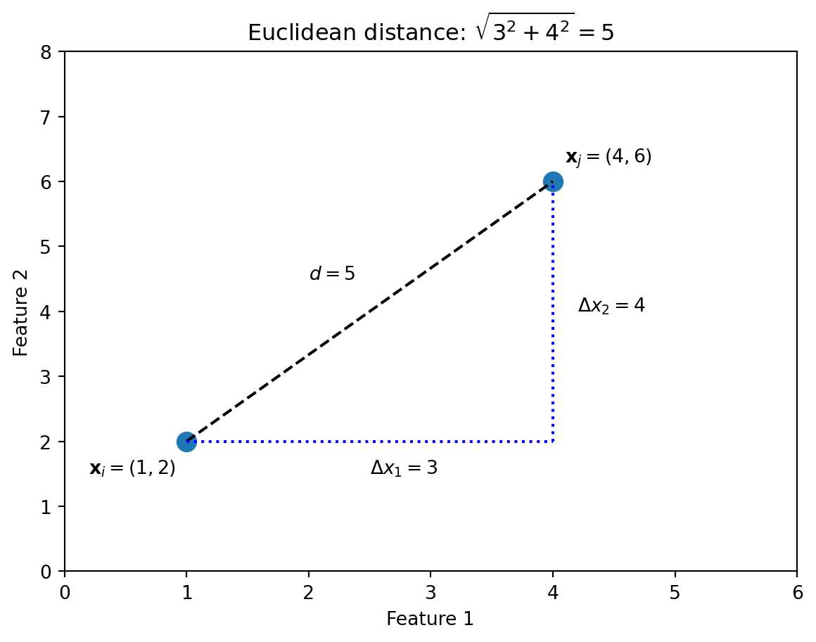 import numpy as npimport matplotlib.pyplot as plt# Two points forming a 3-4-5 right trianglep1 = np.array([1, 2])p2 = np.array([4, 6])fig, ax = plt.subplots()# Plot the two pointsax.scatter([p1[0], p2[0]], [p1[1], p2[1]], s=100)ax.annotate('$\\mathbf{x}_i = (1, 2)$', p1, xytext=(p1[0]-0.8, p1[1]-0.5))ax.annotate('$\\mathbf{x}_j = (4, 6)$', p2, xytext=(p2[0]+0.1, p2[1]+0.3))# Draw the distance line (hypotenuse)ax.plot([p1[0], p2[0]], [p1[1], p2[1]], 'k--')# Draw the right triangle legsax.plot([p1[0], p2[0]], [p1[1], p1[1]], 'b:') # horizontal legax.plot([p2[0], p2[0]], [p1[1], p2[1]], 'b:') # vertical leg# Label the sidesax.text(2.5, 1.5, '$\\Delta x_1 = 3$')ax.text(4.2, 4, '$\\Delta x_2 = 4$')ax.text(2, 4.5, '$d = 5$')ax.set_xlabel('Feature 1')ax.set_ylabel('Feature 2')ax.set_title('Euclidean distance: $\\sqrt{3^2 + 4^2} = 5$')ax.set_xlim(0, 6)ax.set_ylim(0, 8)plt.show()