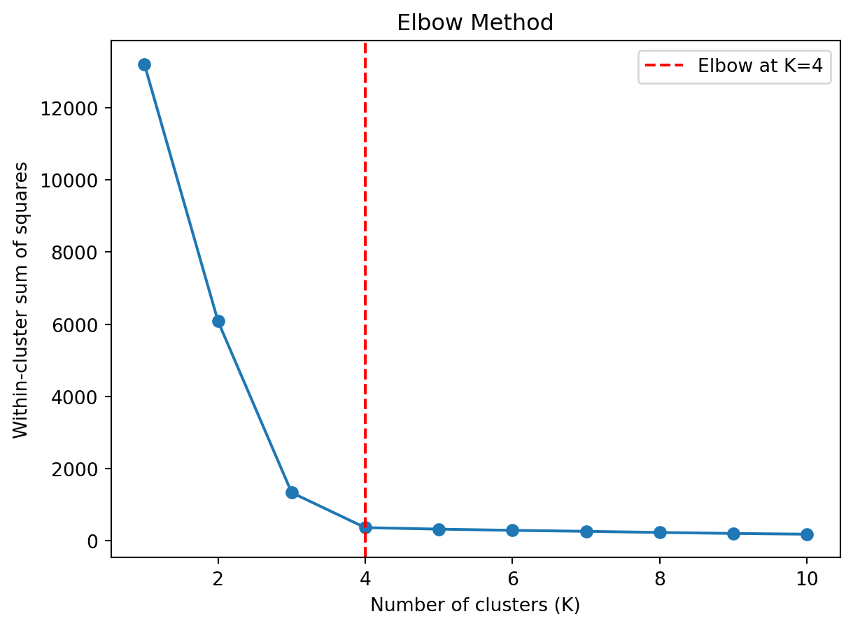 from sklearn.datasets import make_blobs# Generate data with 4 natural clustersnp.random.seed(42)X, _ = make_blobs(n_samples=200, centers=4, cluster_std=1.0)# Compute WCSS for different values of Kwcss = []K_range =range(1, 11)for k in K_range: kmeans = KMeans(n_clusters=k, random_state=42, n_init=10) kmeans.fit(X) wcss.append(kmeans.inertia_) # inertia_ is sklearn's name for WCSSfig, ax = plt.subplots()ax.plot(K_range, wcss, 'o-')ax.set_xlabel('Number of clusters (K)')ax.set_ylabel('Within-cluster sum of squares')ax.set_title('Elbow Method')ax.axvline(x=4, color='red', linestyle='--', label='Elbow at K=4')ax.legend()plt.show()