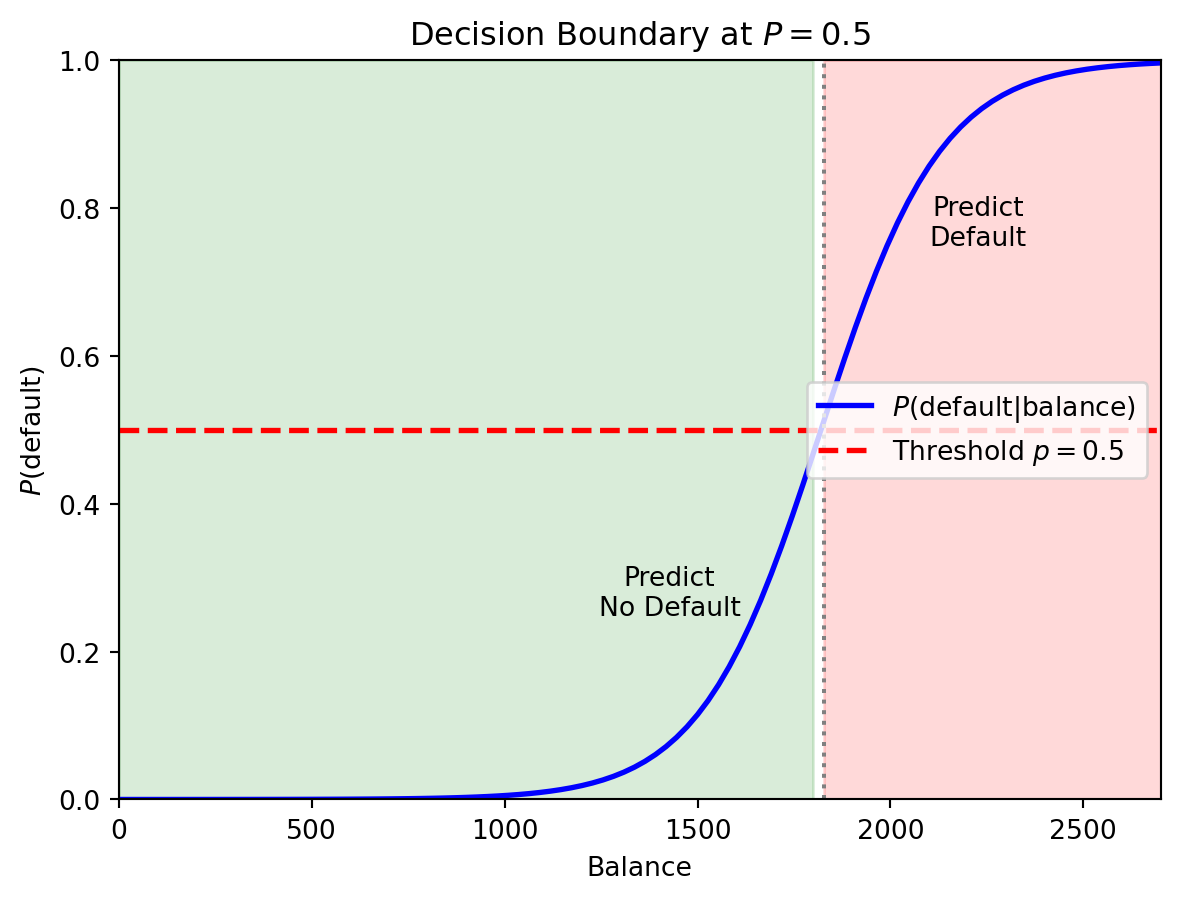 Logistic regression gives us a probability, but ultimately we need a classification — default or not. To convert probability to a class label, we choose a threshold (also called a cutoff). The default rule is to predict class 1 if \(P(y = 1 \,|\, \mathbf{x}) > 0.5\):
