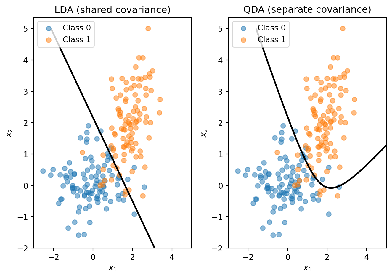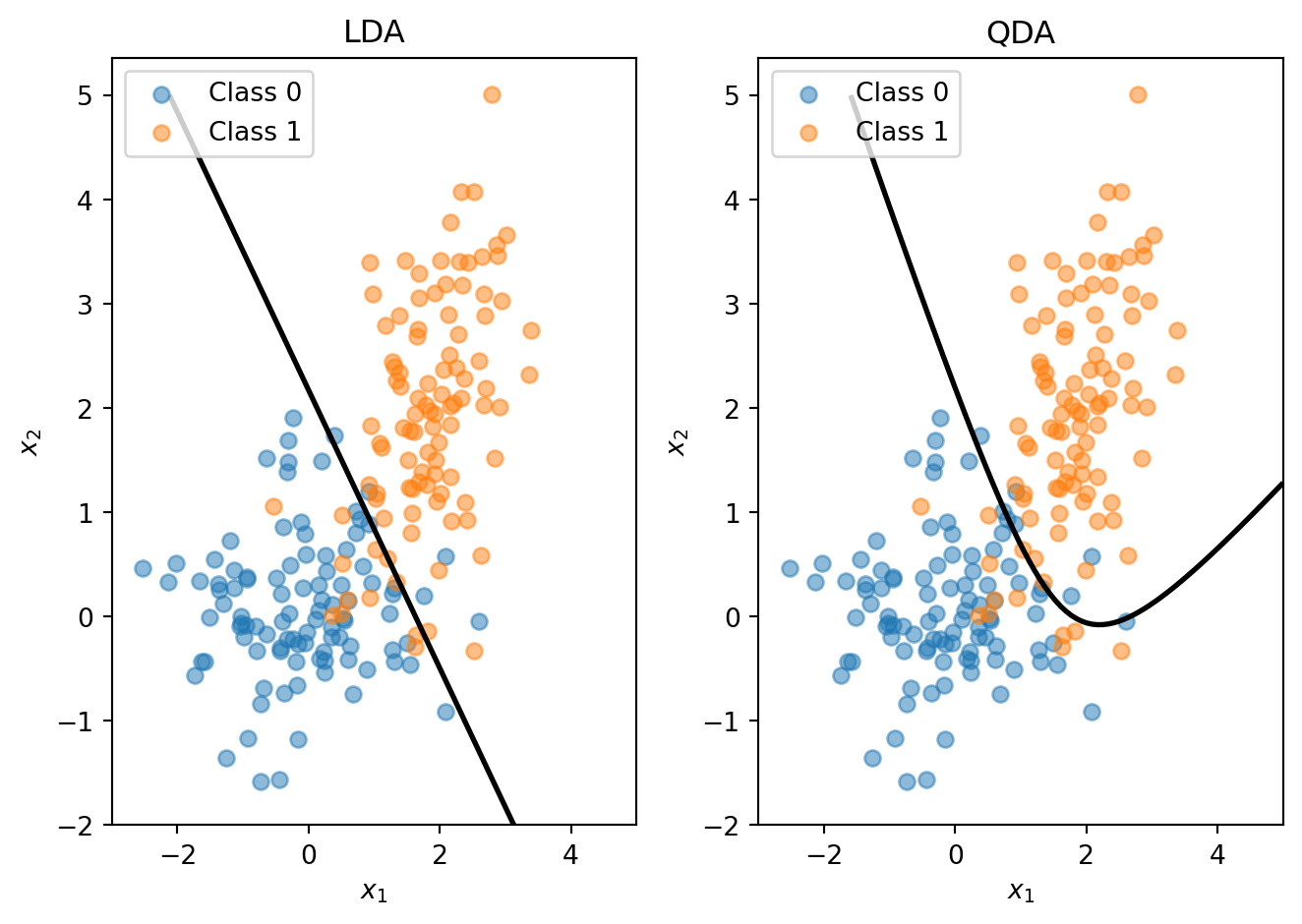 LDA’s shared-covariance assumption is what makes the discriminant function linear in \(\mathbf{x}\). Quadratic Discriminant Analysis (QDA) relaxes this: each class gets its own covariance matrix \(\boldsymbol{\Sigma}_k\).