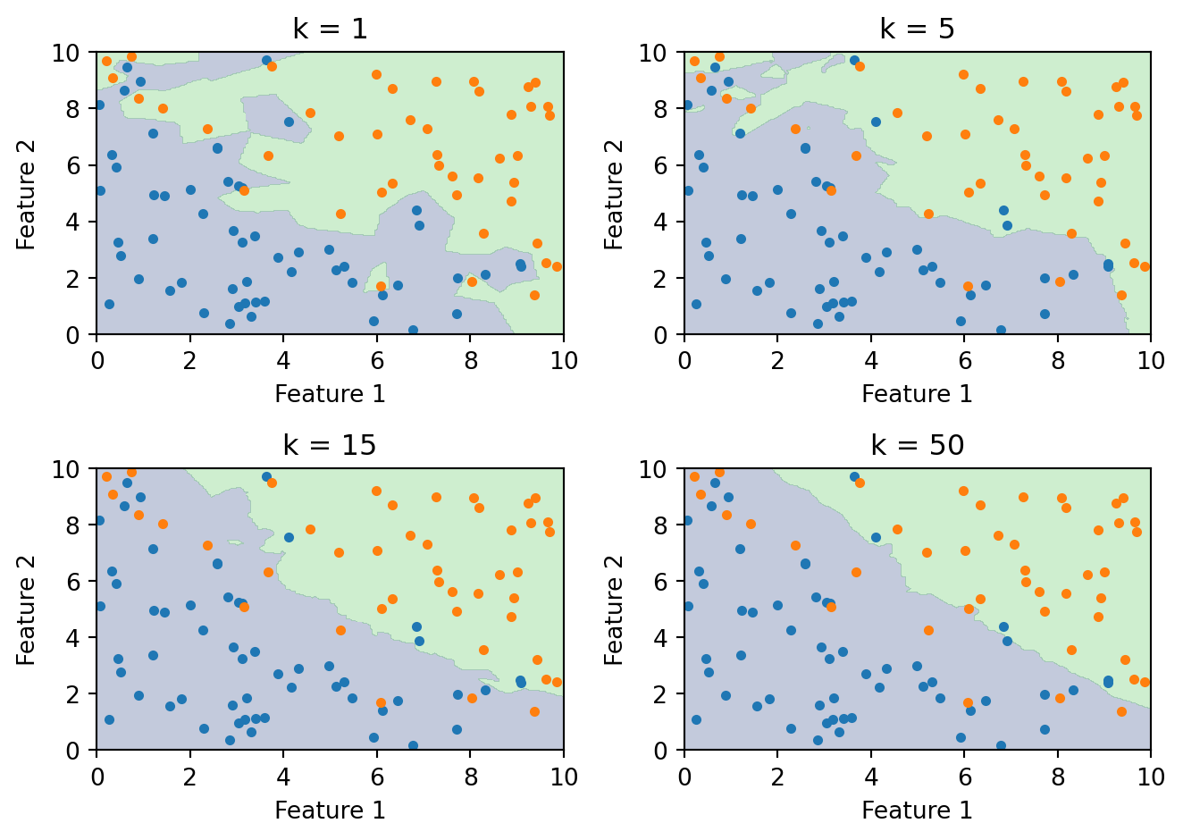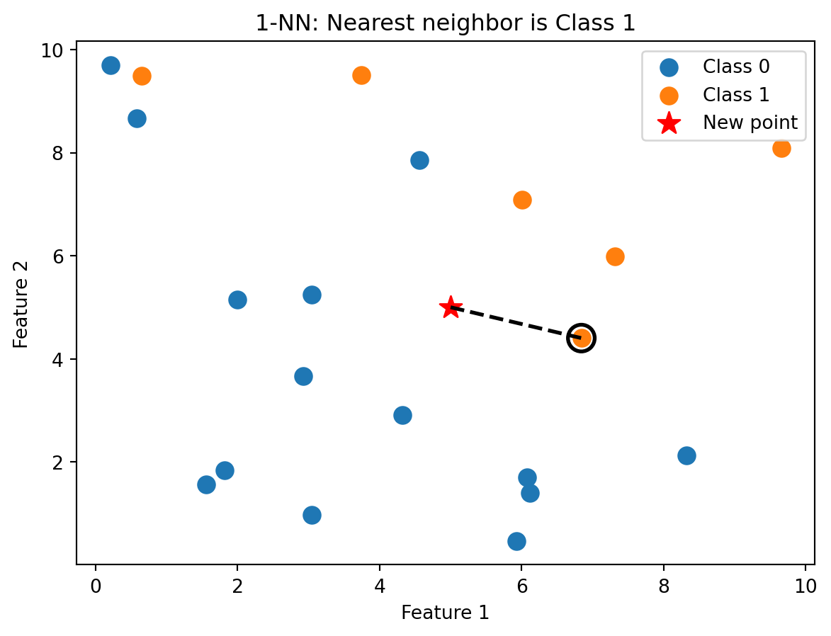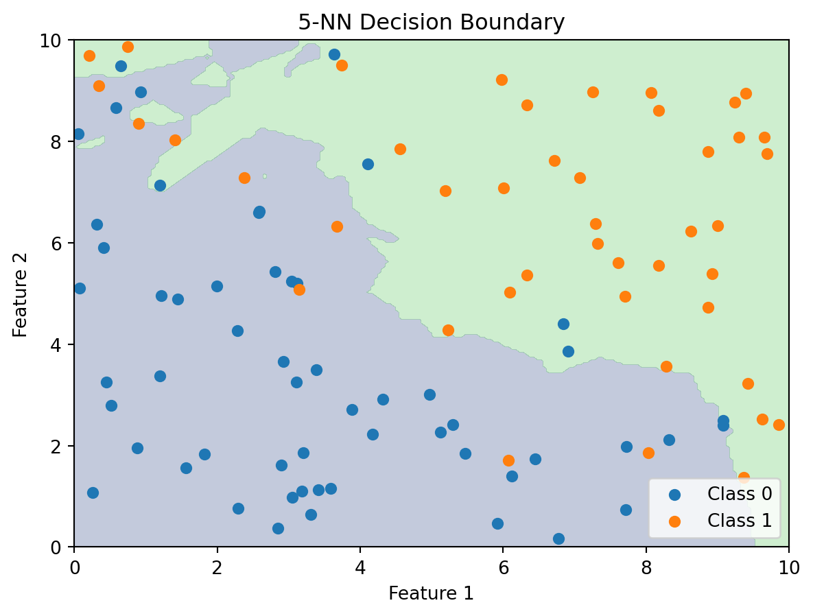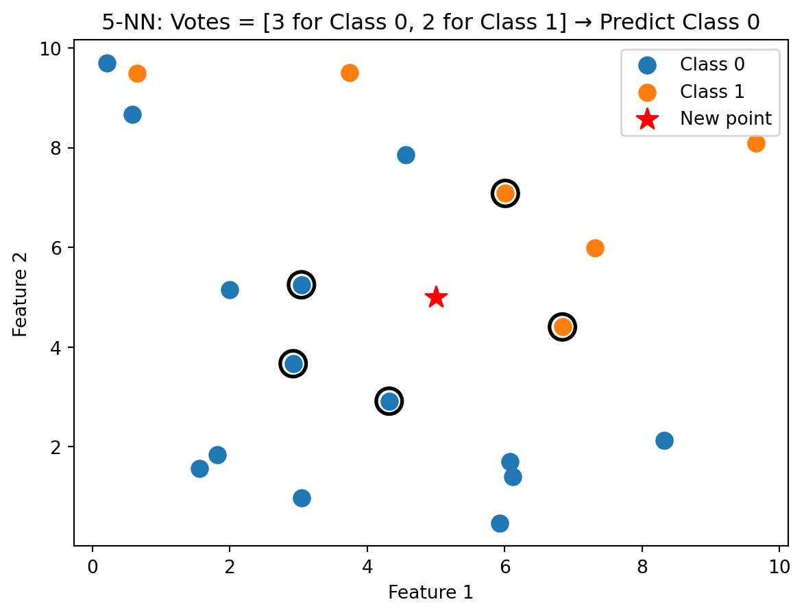 - k-Nearest Neighbors classifies by majority vote of the \(k\) closest training points. It’s nonparametric and can learn any boundary shape, but struggles in high dimensions and requires careful choice of \(k\).