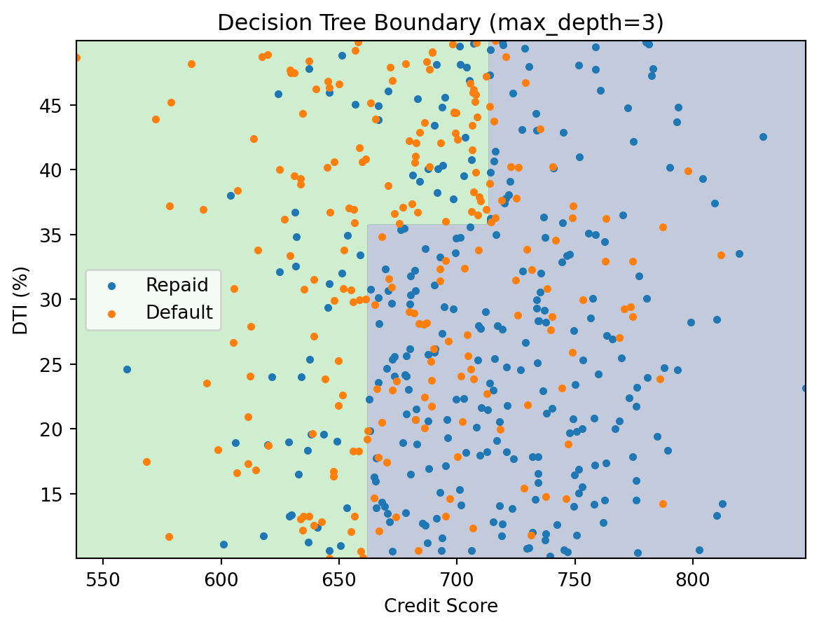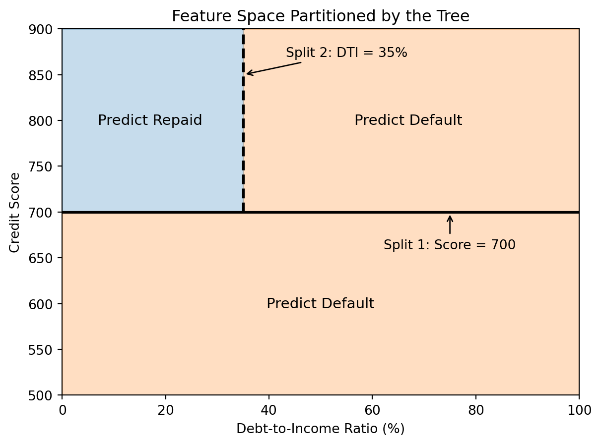 - Decision trees recursively partition the feature space with axis-aligned splits, chosen to minimize impurity (Gini or entropy). They’re easy to interpret but prone to overfitting and instability — problems that ensemble methods (next lecture) are designed to fix.