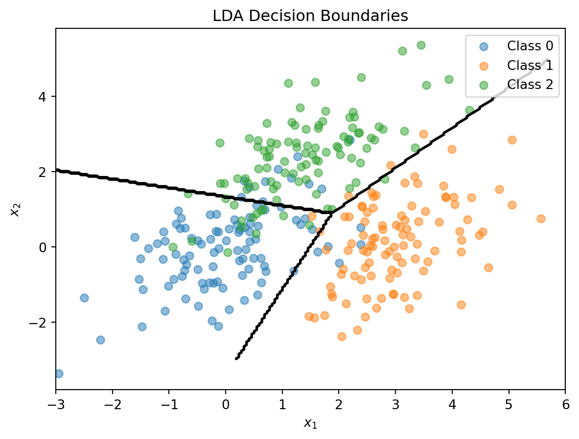 This is a linear equation in \(\mathbf{x}\), so the boundary is a line (in 2D) or hyperplane (in higher dimensions). With \(K\) classes there are \(K(K-1)/2\) pairwise boundaries, but only \(K - 1\) of them matter for defining the decision regions.