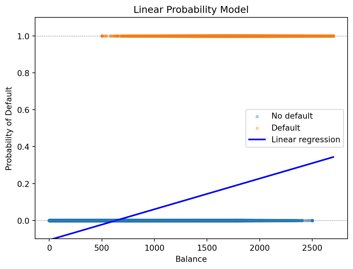 Since we encoded default as 0/1 anyway, why not simply fit a linear regression \(\hat{y} = \beta_0 + \boldsymbol{\beta}'\mathbf{x}\) and interpret the fitted values as probabilities? This approach is called the linear probability model, and it does have a fatal flaw.