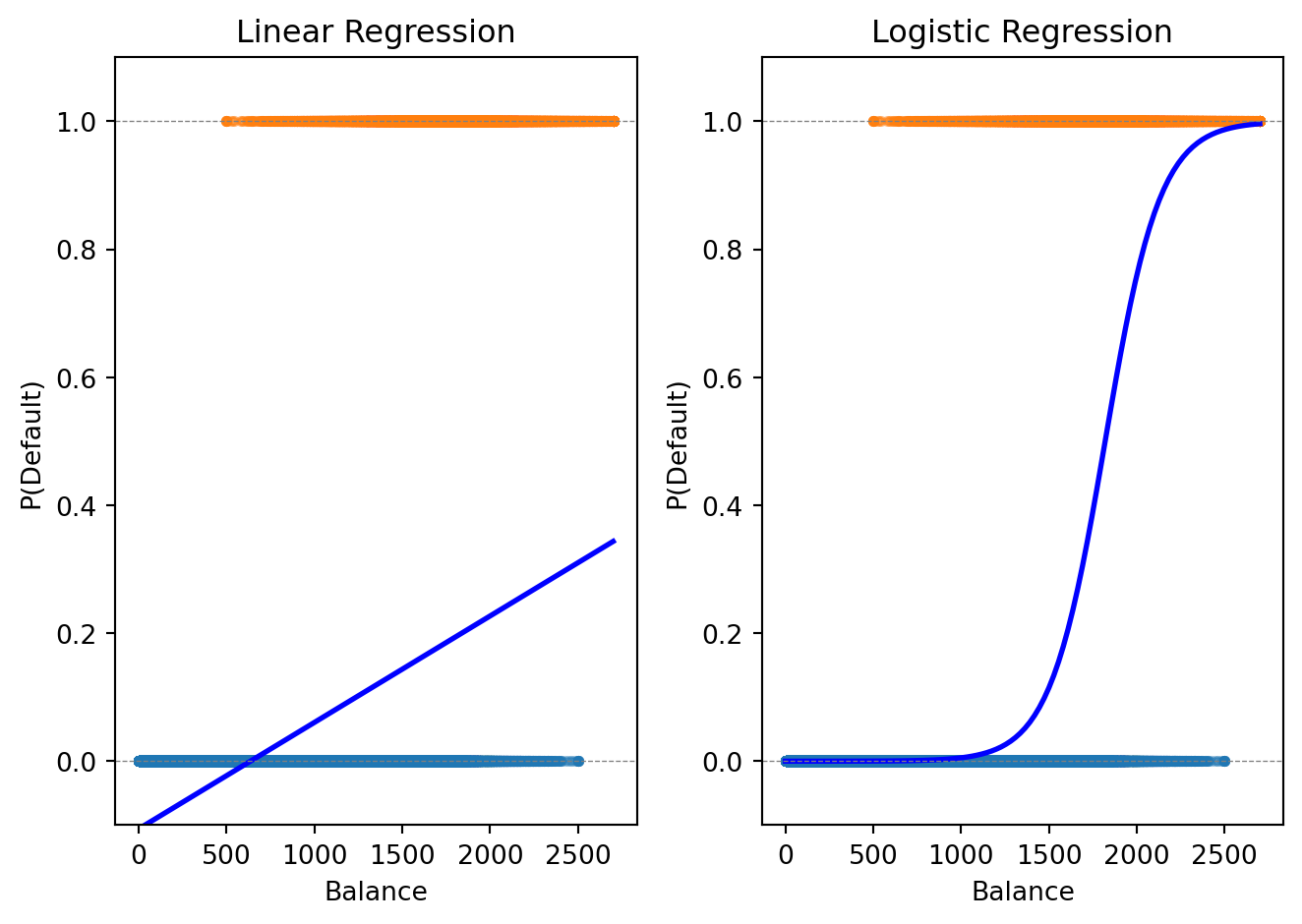 The logistic curve stays within \([0, 1]\) and captures the S-shaped relationship between balance and default probability. Where the linear model overshoots or undershoots, the logistic model produces valid probabilities.