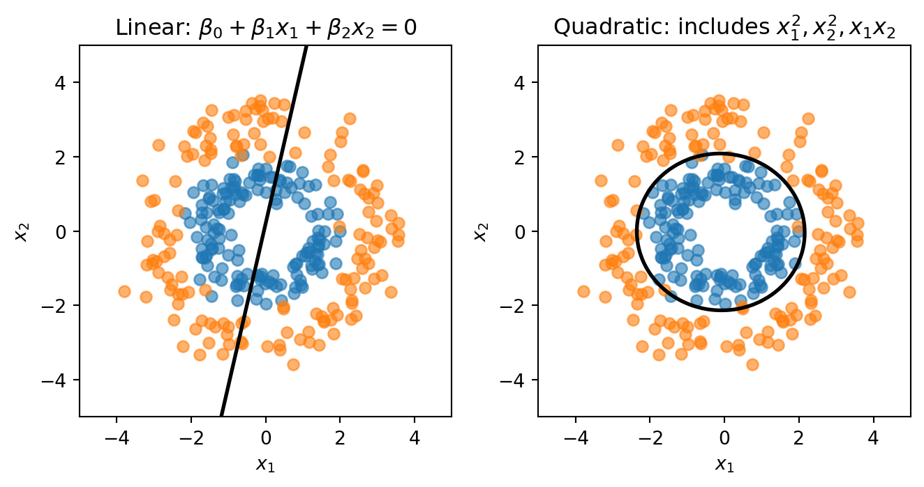 This is quadratic in \(\mathbf{x}\), giving curved decision boundaries. There is a trade-off between the methods: LDA has more restrictive assumptions, fewer parameters to estimate, and is more stable; QDA is more flexible, has more parameters, and can overfit with small samples.
