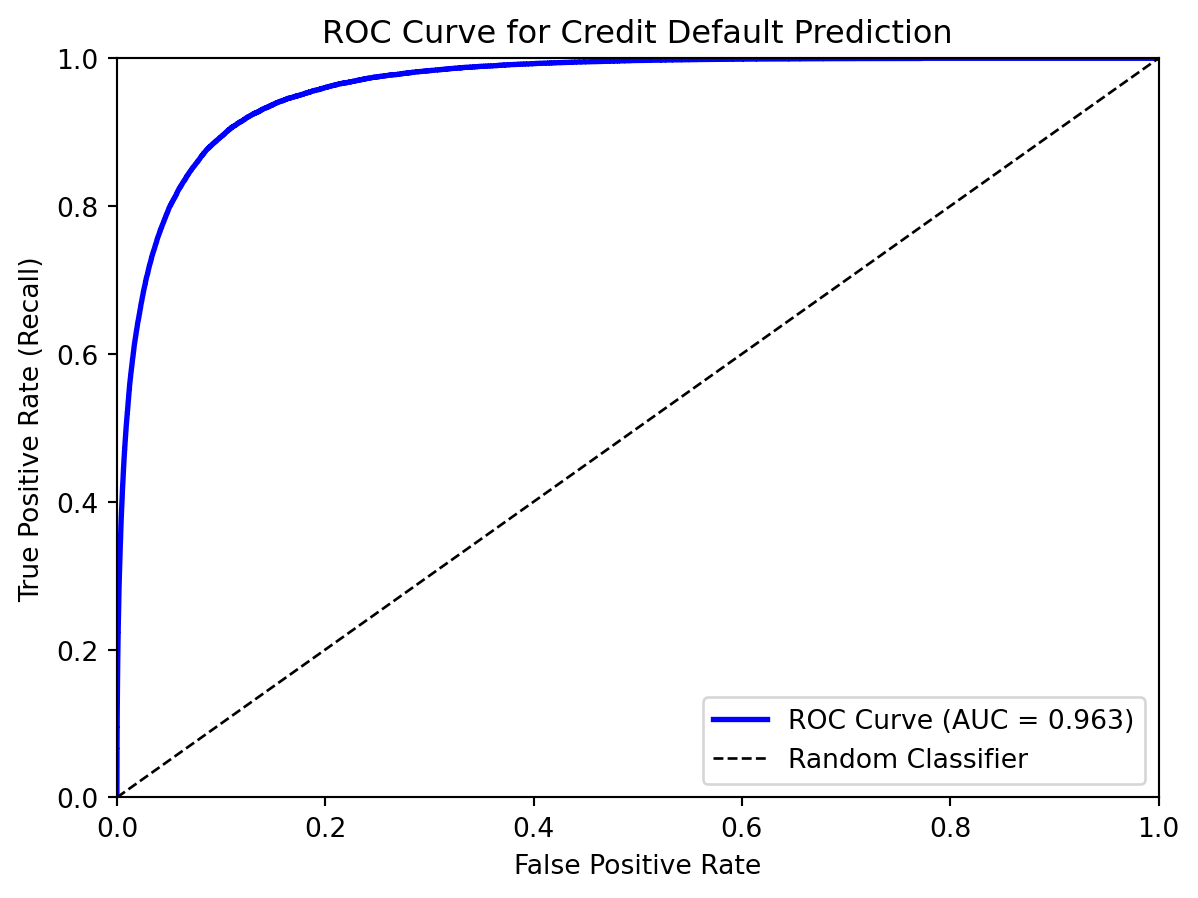 There’s a fundamental trade-off between precision and recall. A very low threshold (like 0.01) gives nearly perfect recall—we catch almost all defaults—but terrible precision because we flag almost everyone. A very high threshold (like 0.99) gives nearly perfect precision—when we flag someone, they almost certainly will default—but terrible recall because we catch almost nobody.