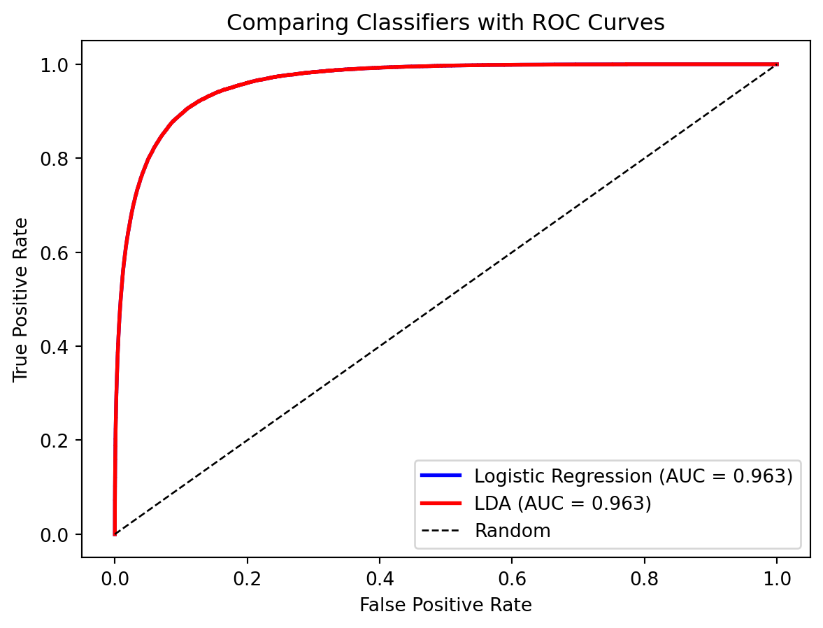 The ROC curves are nearly identical—both methods perform similarly on this dataset. The AUC provides a single number for comparison.