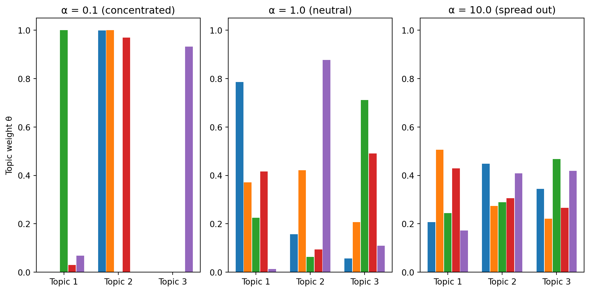 Topic modeling: LDA (Blei, Ng, and Jordan 2003) discovers latent themes as mixtures of words, controlled by the Dirichlet distribution. Each document is a mixture of topics. Bybee et al. (2023) applied LDA to 800,000 WSJ articles and found that shifts in news attention predict macroeconomic variables.