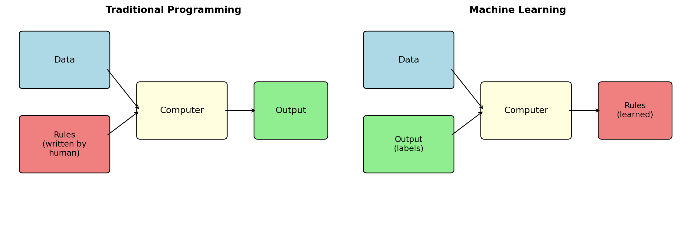 Traditional programming: Human writes rules, computer applies them to data.