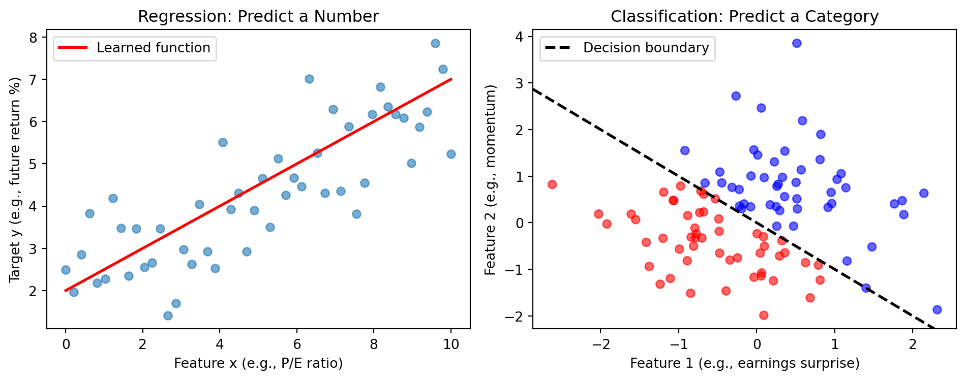 | Regression | Continuous (real-valued) | Predict stock return, house price |