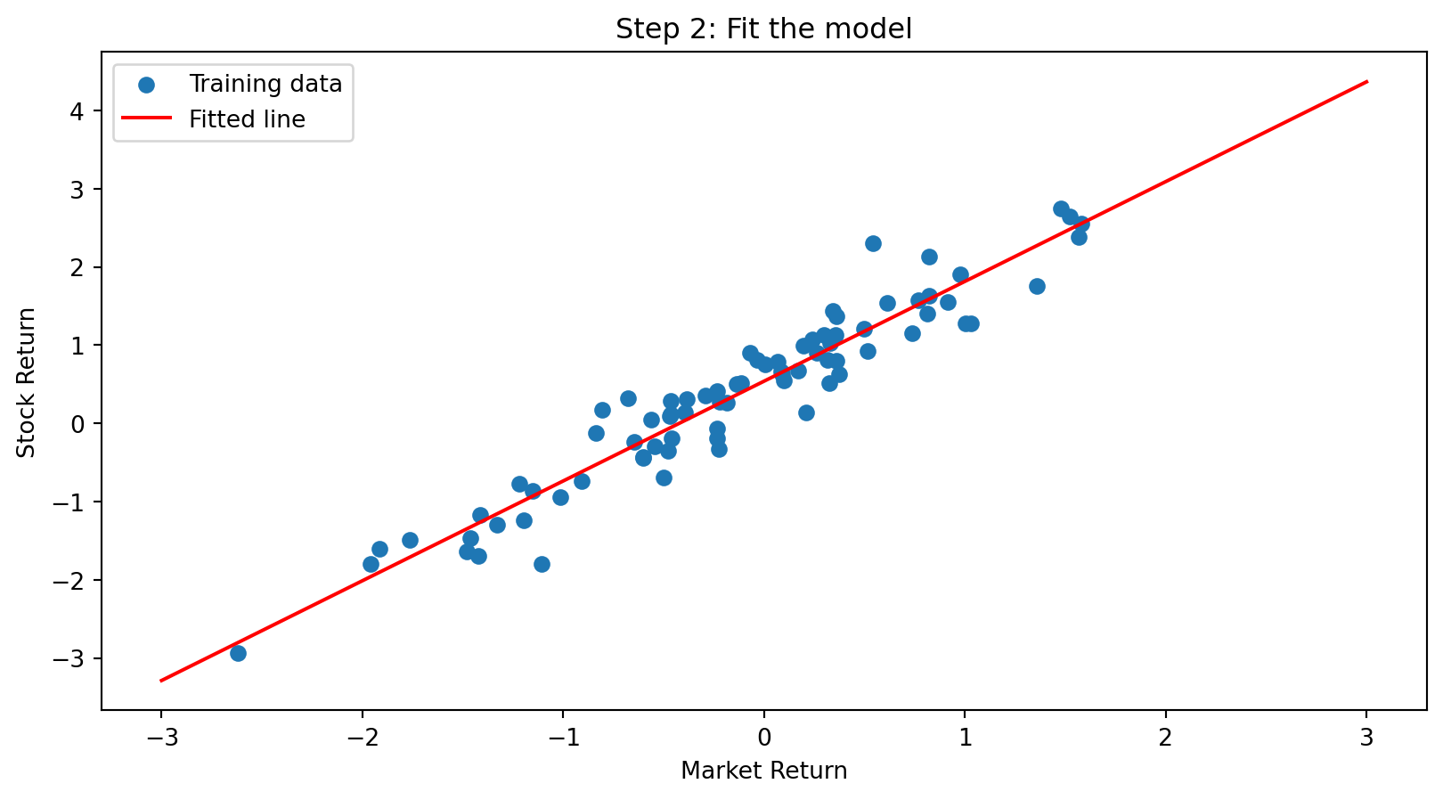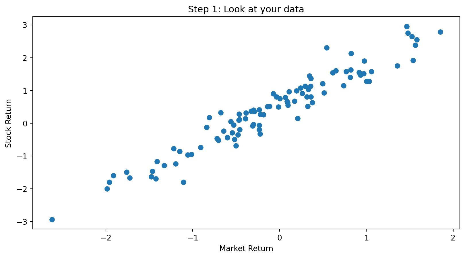 data['stock_return'] = 0.5 + 1.2 * data['market_return'] + 0.3 * np.random.randn(100)