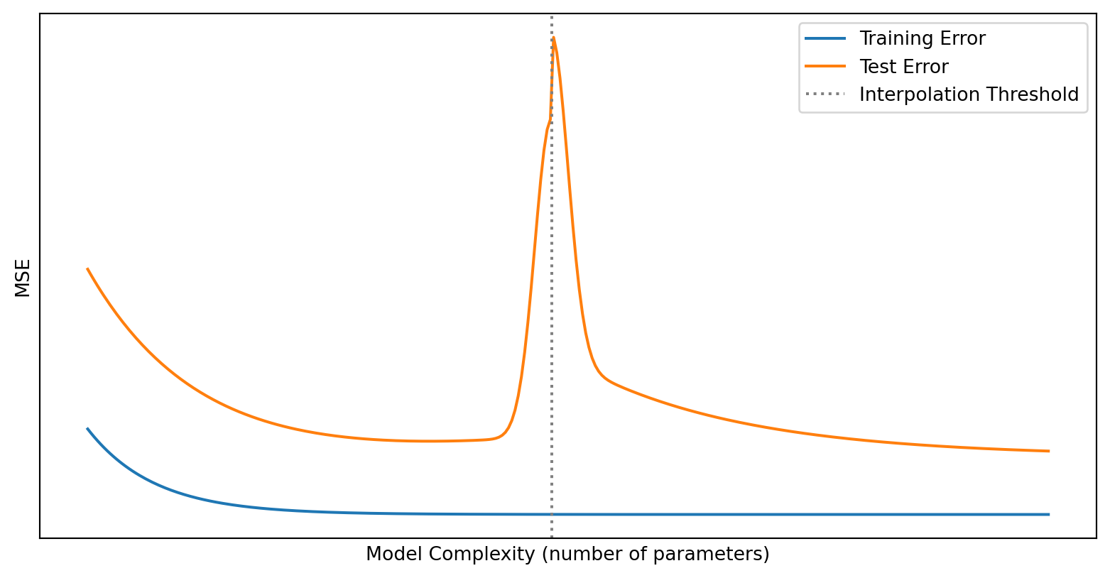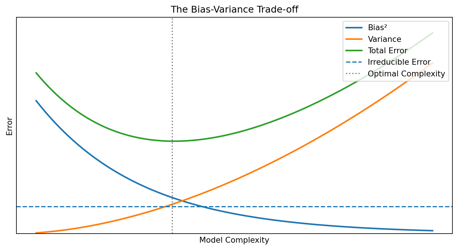 Bias-variance trade-off: Simple models have high bias/low variance; complex models have low bias/high variance. Total error is minimized at intermediate complexity. (Though double descent shows this isn’t the whole story for very large models.)