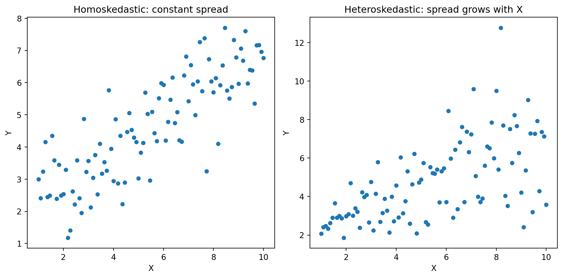 Homoskedasticity: The spread of errors is constant across all values of \(X\). “Homo” = same, “skedastic” = scatter.