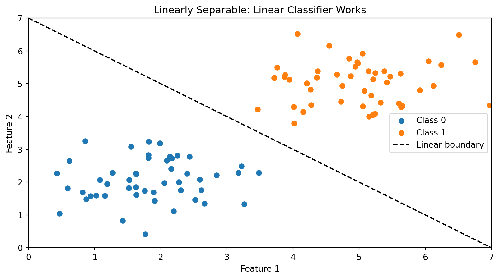 A simple linear boundary perfectly separates the two classes.