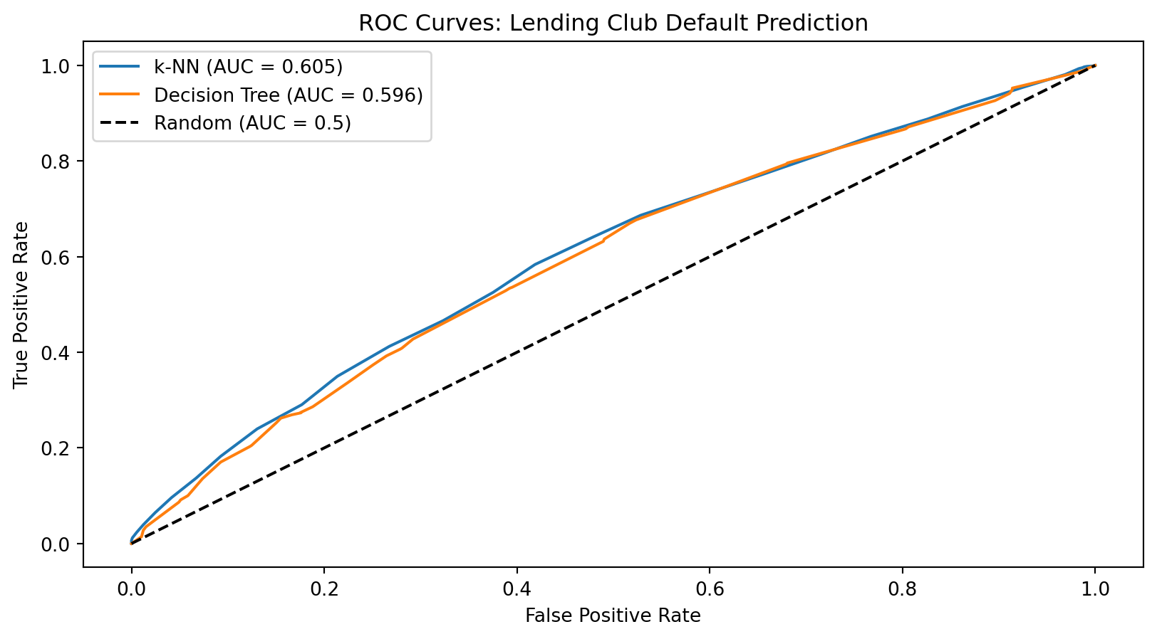 The ROC curve shows the tradeoff between catching defaults (true positive rate) and falsely flagging good loans (false positive rate).