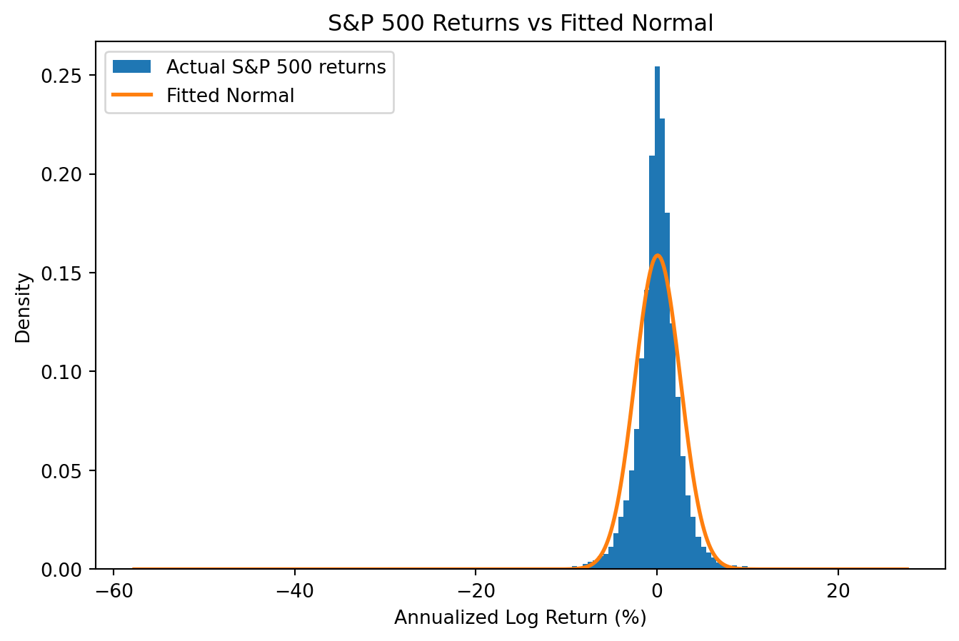 import numpy as npimport pandas as pdimport matplotlib.pyplot as pltfrom scipy import statsimport os# Load S&P 500 data (cache locally to avoid repeated downloads)csv_path ='sp500_yf.csv'if os.path.exists(csv_path): sp500 = pd.read_csv(csv_path, index_col='Date', parse_dates=True)else:import yfinance as yf sp500 = yf.download('^GSPC', start='1950-01-01', end='2025-12-31', progress=False) sp500.columns = sp500.columns.get_level_values(0) # Flatten multi-level columns sp500.to_csv(csv_path)sp500['log_return'] = np.log(sp500['Close'] / sp500['Close'].shift(1))returns = sp500['log_return'].dropna()# Annualize: multiply by 252 trading daysreturns_annual = returns *252# Fit a normal distribution using sample mean and std devmu_hat = returns_annual.mean()sigma_hat = returns_annual.std()# Plot histogram of actual returns (log scale on y-axis)fig, ax = plt.subplots(figsize=(8, 5))ax.hist(returns_annual, bins=150, density=True, label='Actual S&P 500 returns')# Overlay the FITTED normal distribution (same mean and std dev)x = np.linspace(returns_annual.min(), returns_annual.max(), 500)ax.plot(x, stats.norm.pdf(x, mu_hat, sigma_hat), label='Fitted Normal', linewidth=2)ax.set_xlabel('Annualized Log Return (%)')ax.set_ylabel('Density')ax.legend()ax.set_title('S&P 500 Returns vs Fitted Normal')plt.show()# Count extreme events (using daily standardized returns)standardized = (returns - returns.mean()) / returns.std()n_extreme = (abs(standardized) >4).sum()expected_normal =len(returns) *2* stats.norm.sf(4) # two-tailedprint(f"Observations beyond 4 std devs: {n_extreme}")print(f"Normal distribution predicts: {expected_normal:.1f}")print(f"Actual is {n_extreme/expected_normal:.0f}x more than expected!")