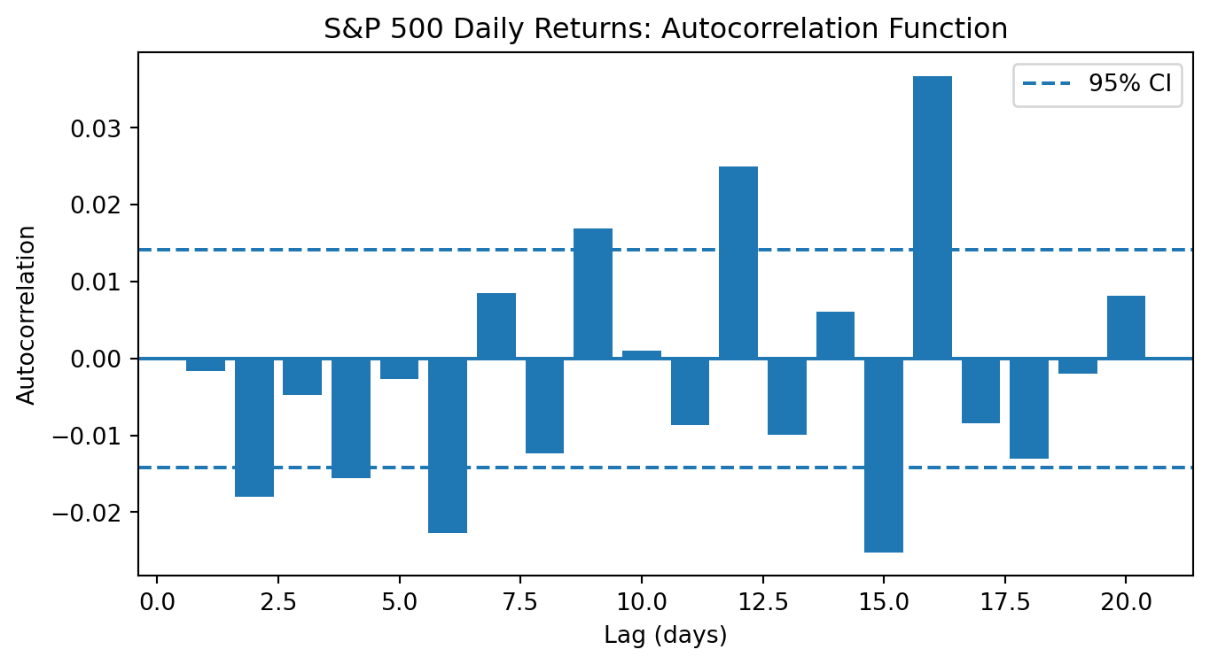 import numpy as npimport pandas as pdimport os# Load S&P 500 datacsv_path ='sp500_yf.csv'sp500 = pd.read_csv(csv_path, index_col='Date', parse_dates=True)sp500['log_return'] = np.log(sp500['Close'] / sp500['Close'].shift(1))returns = sp500['log_return'].dropna()T =len(returns)print(f"Sample size: T = {T:,}")print(f"Standard error under null: 1/√T = {1/np.sqrt(T):.4f}")print(f"95% CI: ±{1.96/np.sqrt(T):.4f}")# Compute autocorrelations at lags 1-10print(f"\nAutocorrelations:")for k inrange(1, 11): rho_k = returns.autocorr(lag=k) z_stat = rho_k * np.sqrt(T) sig ="*"ifabs(z_stat) >1.96else""print(f" Lag {k:2d}: ρ = {rho_k:+.4f}, z = {z_stat:+.2f}{sig}")